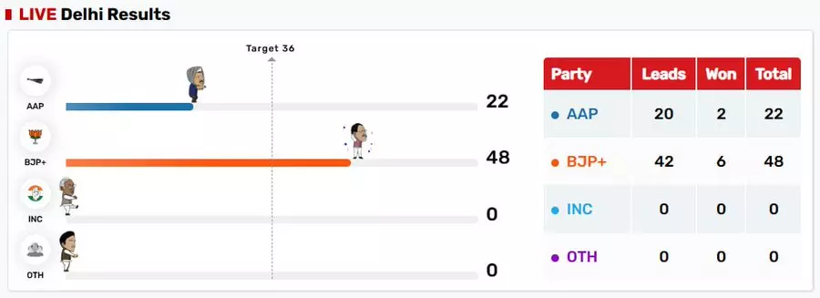 AAP also had some key wins, with Virender Singh Kadian taking Delhi Cantt by 2,029 votes, Kuldeep Kumar securing Kondli with a margin of 6,293 votes, Sahi Ram winning Tughlakabad by 14,711 votes, Jarnail Singh claiming Tilak Nagar with an 11,656-vote lead, and Imran Hussain emerging victorious in Ballimaran by 29,823 votes.