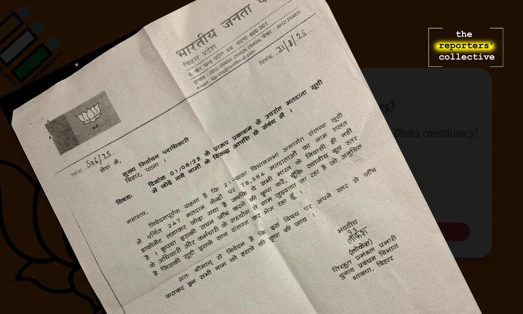 text_fieldsAmid reports of the deletion of about 65 lakh voters after the Special Intensive Revision (SIR) in Bihar, an investigation by the Reporters’ Collective found that about 80,000 Muslims were on the edge of losing their franchise to vote, in a reportedly fraudulent application claiming they were not Indian citizens, with the applications urging their deletion also forwarded by BJP quarters, including the office of the BJP MLA in Dhaka constituency.