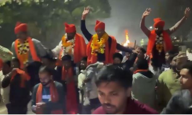 text_fieldsNew Delhi: Bajrang Dal workers gave a ‘hero’s welcome’ to the outfit’s six members who came out of jail after being arrested for vandalizing Christmas decorations at the city’s Magneto Mall in Chhattisgarh’s Raipur on Thursday.