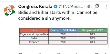 The controversy arose from a now-deleted post on @INCKerala that read: “Bidis and Bihar start from B. Cannot be considered a sin anymore.”