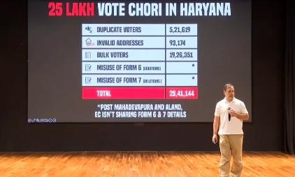 Gandhi, unveiling what he called the “H-Bomb”, accused the ECI of “stealing votes” and claimed that one in every eight voters in Haryana was fake, a figure amounting to 12.5% of the electorate in a state with around two crore voters. He alleged that exit polls had predicted a Congress victory, but the BJP retained power through rigging, duplicate entries, and “bulk voting”.