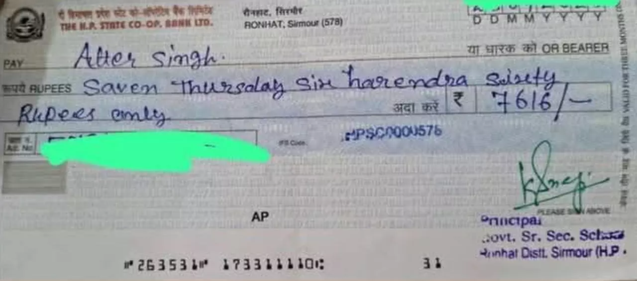 Cheque for ₹7,616 issued by a Himachal Pradesh government school teacher mistakenly reads “Saven Thursday Six Harendra Sixty”