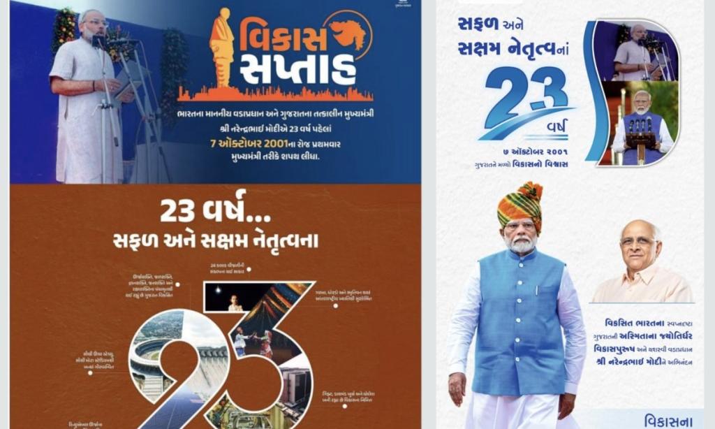 On 7 October 2024, full-page and half-page advertisements appeared in major Gujarati newspapers carrying messages of praise for Modi’s leadership, portraying him as the architect of development in both Gujarat and the country.