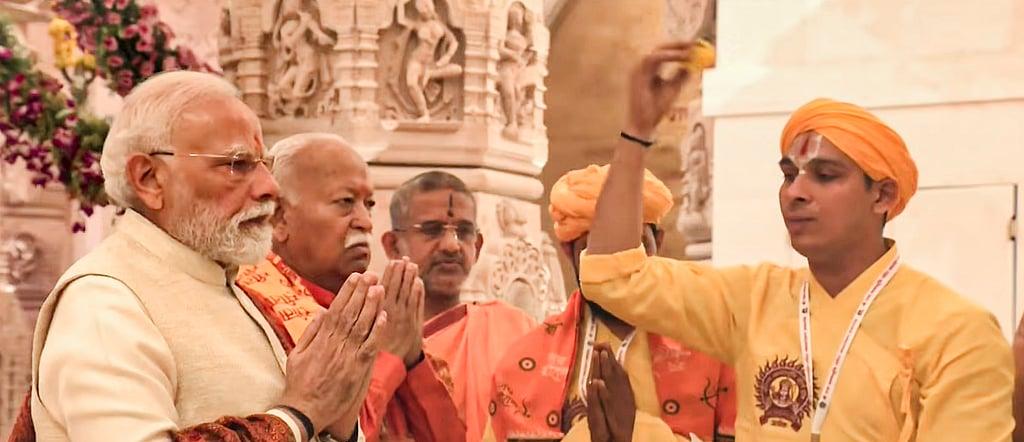 He carried out the ritual in the presence of RSS chief Mohan Bhagwat, Uttar Pradesh Governor Anandiben Patel, and Chief Minister Yogi Adityanath. The ceremony was timed to coincide with the Abhijit Muhurat, regarded in Hindu tradition as an especially auspicious period.