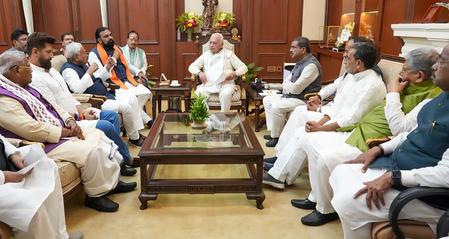 Senior NDA leaders, including Union Minister Dharmendra Pradhan, Samrat Choudhary, Vijay Kumar Sinha, and others, accompanied him to the Raj Bhavan.