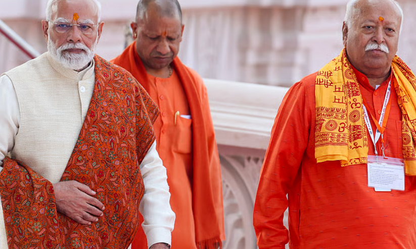The prime minister, standing with Mohan Bhagwat and Yogi Adityanath, raised the triangular saffron flag bearing the word “Om” and the image of the kovidara tree, and he described it as a symbol of cultural resurgence while asserting that the moment represented the end of a long historical struggle.