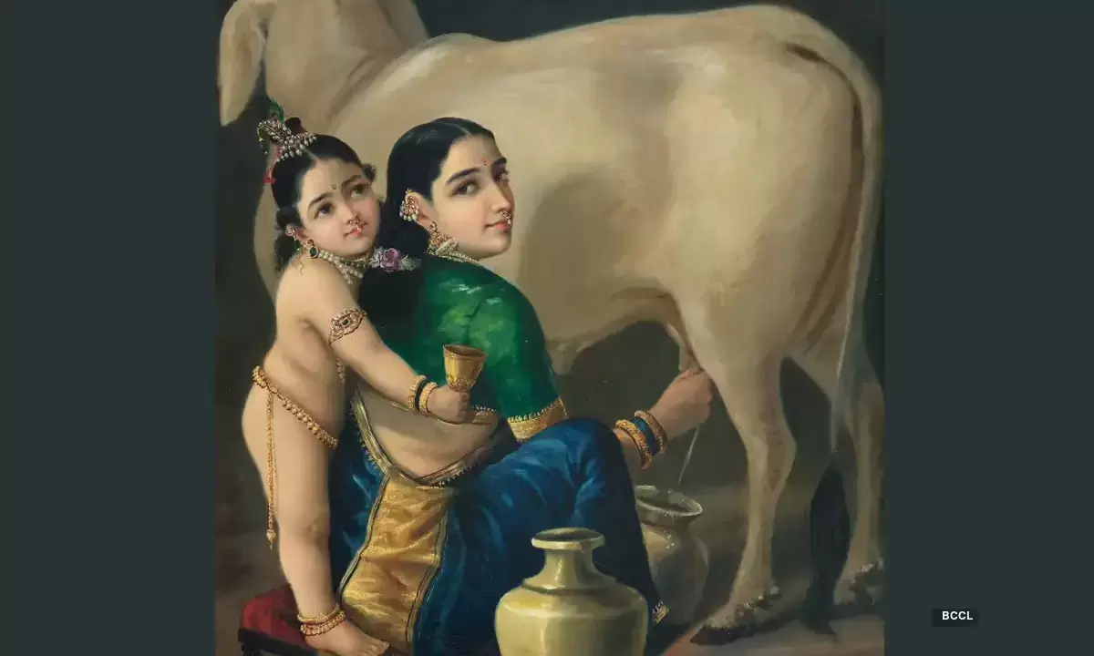 Painted in the 1890s, during the height of Varma’s career, the artwork presents a nuanced depiction of maternal love through the mythological figures of the infant Lord Krishna and his foster mother, Yashoda. The painting shows Yashoda milking a cow while Krishna reaches for a goblet of milk from behind, drawing viewers into a domestic scene that transforms into a participation in a larger, sacred narrative. It is widely regarded as one of Varma’s most significant and evocative compositions.