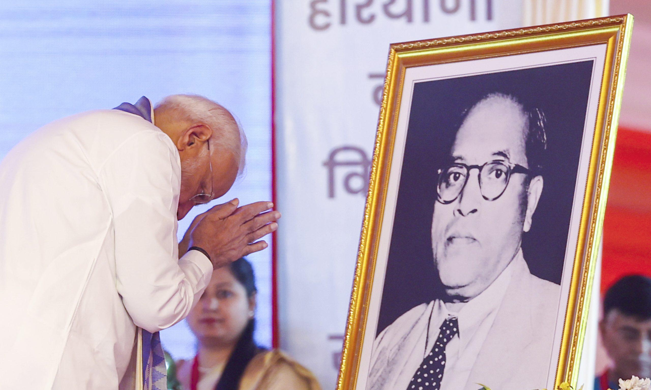 text_fieldsPrime Minister Narendra Modi bowing before a photograph of Dr B.R. Ambedkar on his birth anniversary, April 14, 2025