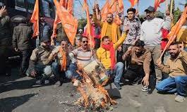 Dozens of protesters carrying saffron flags burnt an effigy of Jammu and Kashmir Chief Minister Omar Abdullah and demanded that the government set up a task force to investigate encroachment on land belonging to the Jammu Development Authority. The demand was earlier raised in the assembly by BJP Bahu legislator Vikram Randhawa.
