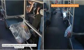 In the footage, passengers are seen tying their trash in bags and hanging them beside their seats instead of discarding it inside the train or throwing it out of windows.