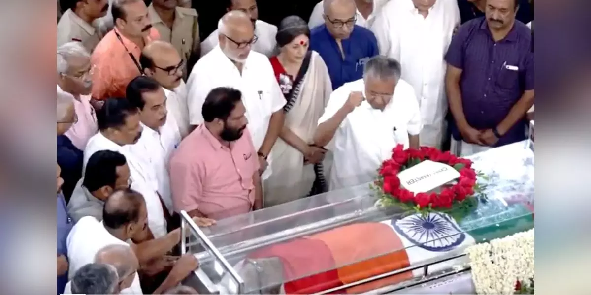 Chief Minister Pinarayi Vijayan was the first to lay a wreath on the coffin of his long-time comrade, with whom he shared a complicated but historic political relationship. Several senior CPI(M) leaders, including General Secretary M.A. Baby — who had served as Education Minister in VS’s cabinet — former General Secretary Prakash Karat, Brinda Karat, and a host of party functionaries, were present to pay their last respects.