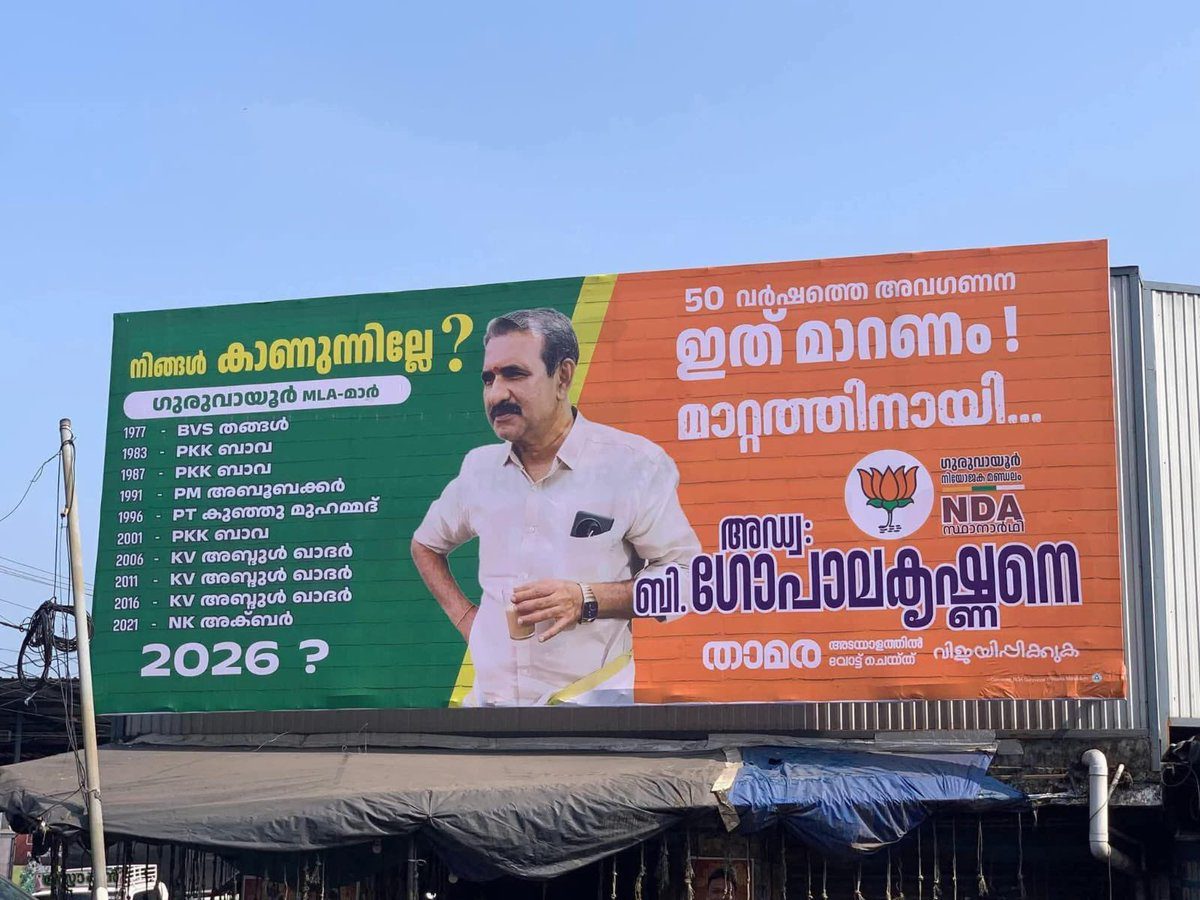 text_fieldsGuruvayoor: NDA’s Guruvayoor candidate B. Gopalakrishnan has once again courted controversy after campaign hoardings allegedly questioning the repeated election of Muslim MLAs in the constituency drew criticism from political opponents and observers.