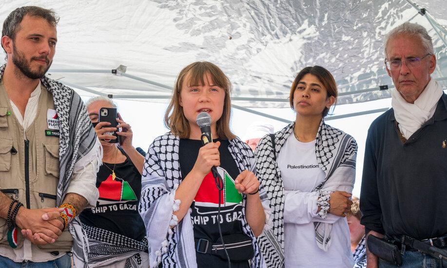 text_fieldsMultiple drones targeted a flotilla of Gaza-bound humanitarian aid ships carrying over 500 volunteers, including Swedish activist Greta Thunberg and Franco-Palestinian lawmaker Rima Hassan, in the waters south of Crete on Wednesday, and the crew reported explosions, chemical sprays, and communications jamming during the attack.