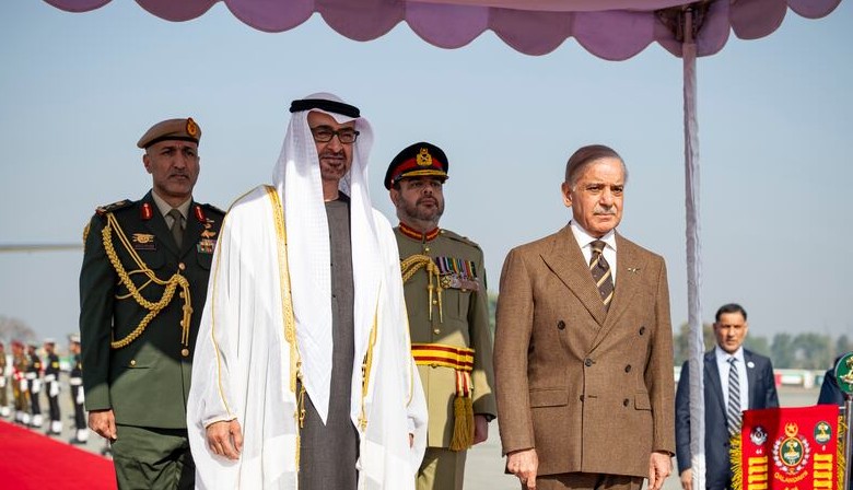 An official reception followed, featuring the national anthems of the UAE and Pakistan, a 21-gun salute and a guard of honour. A military band and cultural groups took part in the ceremony, while children waved the flags of both nations.