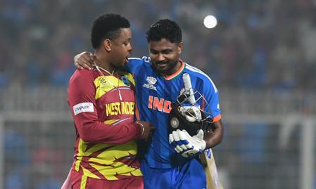 Brief Scores: West Indies 195/4 in 20 ov (Roston Chase 40, Jason Holder 37*, Rovman Powell 34*; Jasprit Bumrah 2-36) lost to India 199/5 in 19.2 ov (Sanju Samson 97*, Tilak Varma 27; Jason Holder 2-38, Shamar Joseph 2-42) by five wickets.