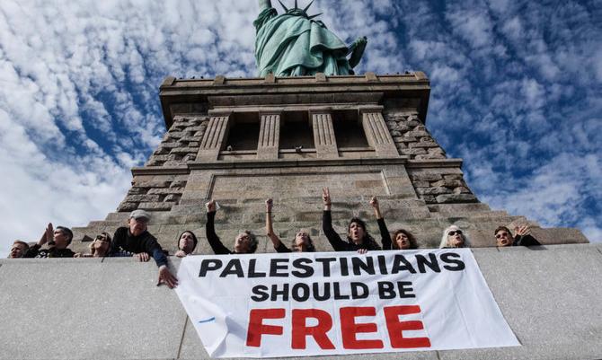 Jewish activists chant slogan that echoed during Holocaust for Gaza at Statue of Liberty